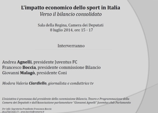 Martedì 8 luglio, dalle ore 15 presso la sala della Regina della Camera dei Deputati, si terrà un confronto tra Francesco Boccia, presidente della Commissione Bilancio della Camera, Andrea Agnelli, presidente della Juventus Fc, e Giovanni Malagò, presidente del Coni, moderati dalla giornalista Valeria Ciardiello. Il dibattito, dal titolo “L’impatto economico dello sport in Italia - Verso il bilancio consolidato”, è organizzato dal presidente della Commissione Bilancio della Camera con l’obiettivo di strutturare, con il Coni, un gruppo di lavoro finalizzato alla valutazione e costituzione di un Bilancio consolidato dello sport e la misurazione dello stesso sul Pil italiano. L’evento è organizzato in collaborazione con l’Associazione parlamentare “Giovanni Agnelli” Juventus club Parlamento.
